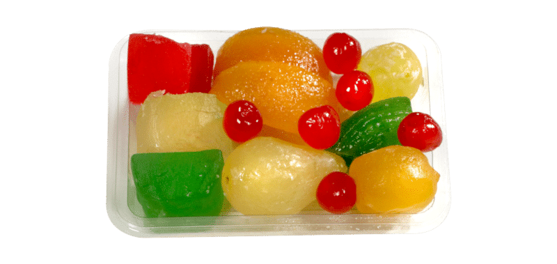 Las frutas confitadas a granel se presentan en caja de distintos tamaños, envueltas individualmente para mejorar su conservación.