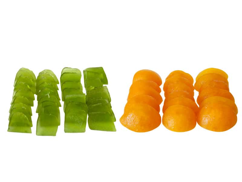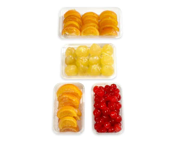 Variedad en fruta glaseada; cerezas, cidra, calabaza, peras, naranja en discos... y en formatos: bandejas, a granel, sin azúcar....